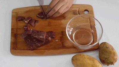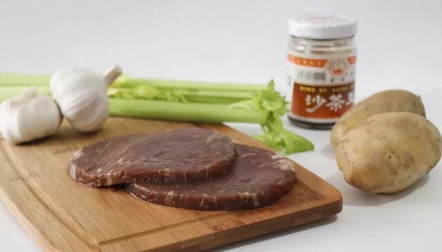 [食材]鲜牛肉、土豆、沙茶酱、生粉、食用油、盐、