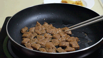 5、将腌制好的牛肉放进热锅,慢火煎至9成熟,即可装盘;