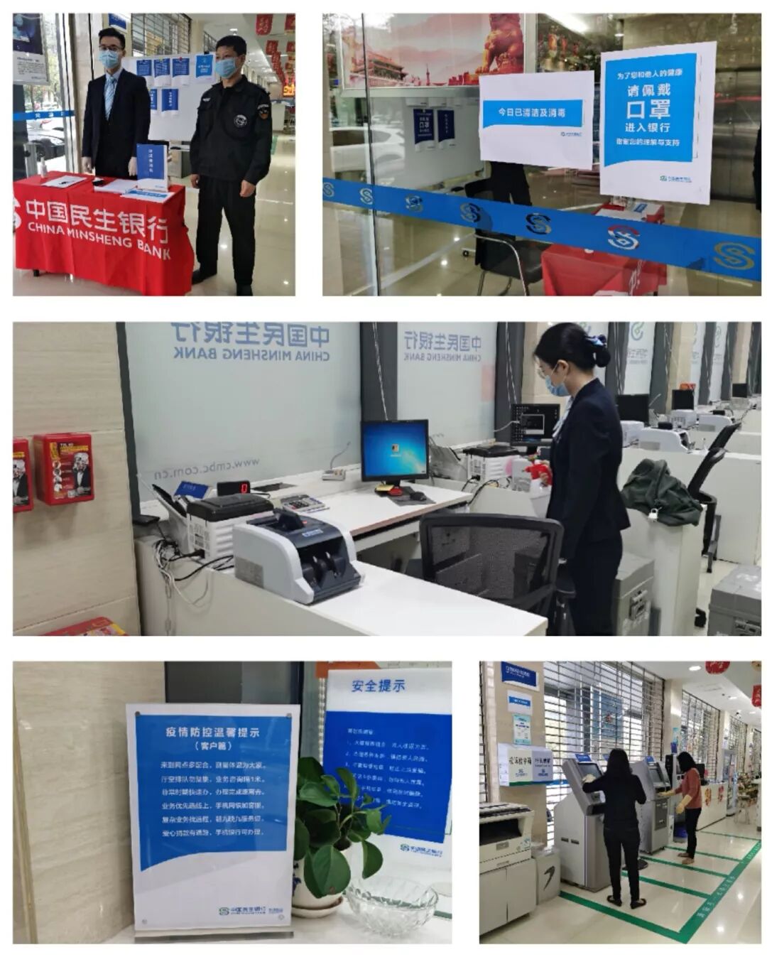 疫情期间,维护客户和员工的安全成为民生银行的工作重心。为给客户提供“有温度”的强大安全保障,民生银行揭阳分行营业部迅速行动,每日做好环境消毒工作,防止因人员流转可能带来的病毒传播;在厅堂张贴设立体温检测点、张贴防控温馨提示,厅堂配备免洗消毒液和一次性医用口罩,确保为员工和客户提供安全的金融服务环境;现金柜台更是做到收支两条线,当天收取的现金在清分后须入库进行消毒处理,确保群众用到“干净钱”、“放心钱”。