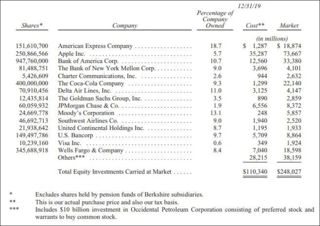 下面我们列出了年底时市值最大的15种普通股投资。我们排除了卡夫亨氏(325,442,152股)的股份,因为伯克希尔是一个控股集团的一部分,因此必须按照“资产净值”的方式将此项投资入账。
