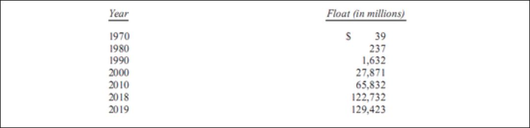 这种先收后付的模式让P/C公司持有大量资金——我们称之为“浮存金”——这些资金最终将流入其它公司。与此同时,保险公司可以为了自己的利益而利用这些浮存金。虽然个体保单和索赔来来往往不会中断,但保险公司持有的浮存金通常相对于保费金额保持相当稳定。
