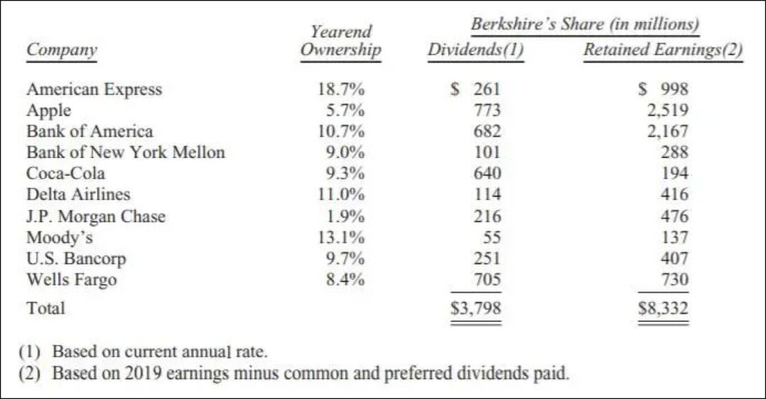 这个清单分别开列了GAAP核算方式下的收益——即伯克希尔投资这十只股票获得的股息,以及在我们的持仓收益中有多少属于投资标的公司留存后投入运营的收益。