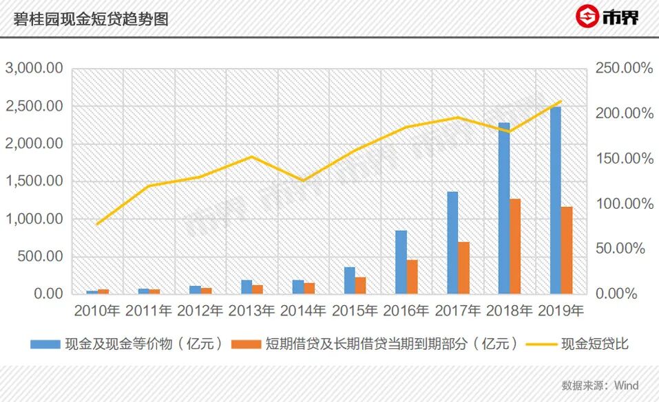 严抓回款和杠杆的背景下,截至2019年末,碧桂园账面现金余额为2683.5亿元,达到有史以来最高水平,一年内将到期的带息债务则较上年有所回落,降至1163亿元,现金短贷比高达2.3倍。