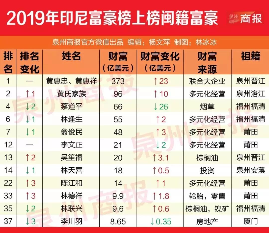 在2019年福布斯公布的印尼十大富豪排行榜上,华人占了半壁江山,福建籍黄惠忠、黄惠祥家族牢牢把控首富宝座,黄志源家族紧随其后,蔡道平、林逢生、翁俊民都在印尼十大富豪榜单之列。