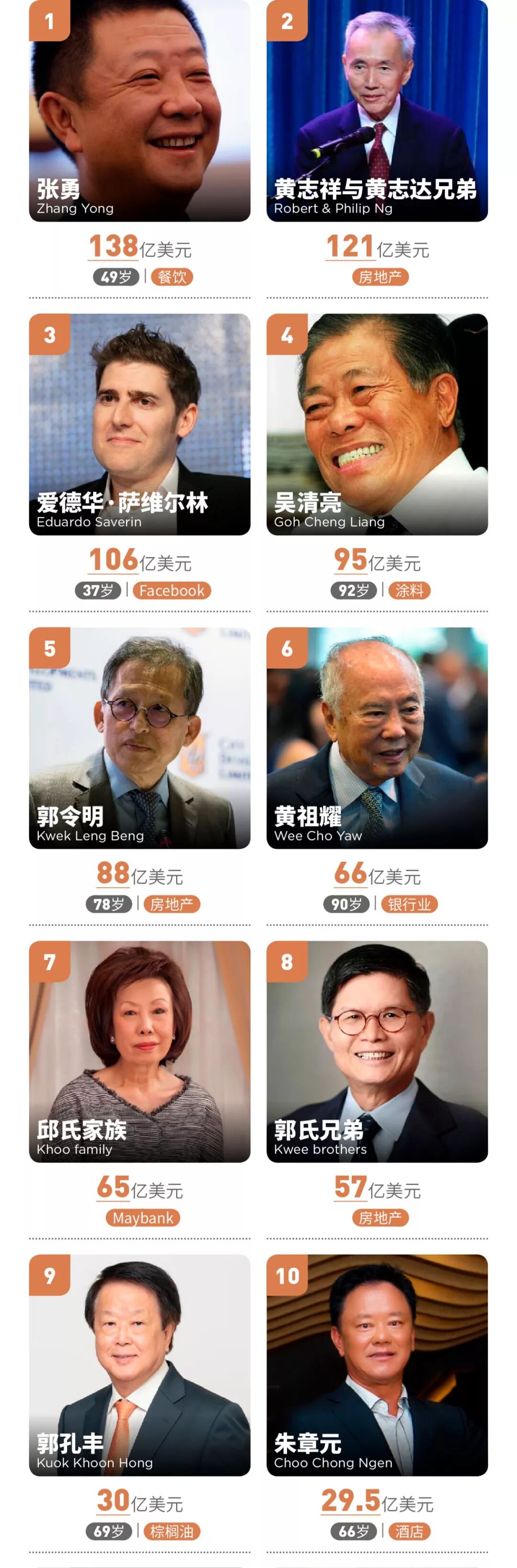 此外,福建厦门籍郭令明,福建金门籍黄祖耀,福建福州籍郭孔丰等均跻身福布斯新加坡富豪榜前十。