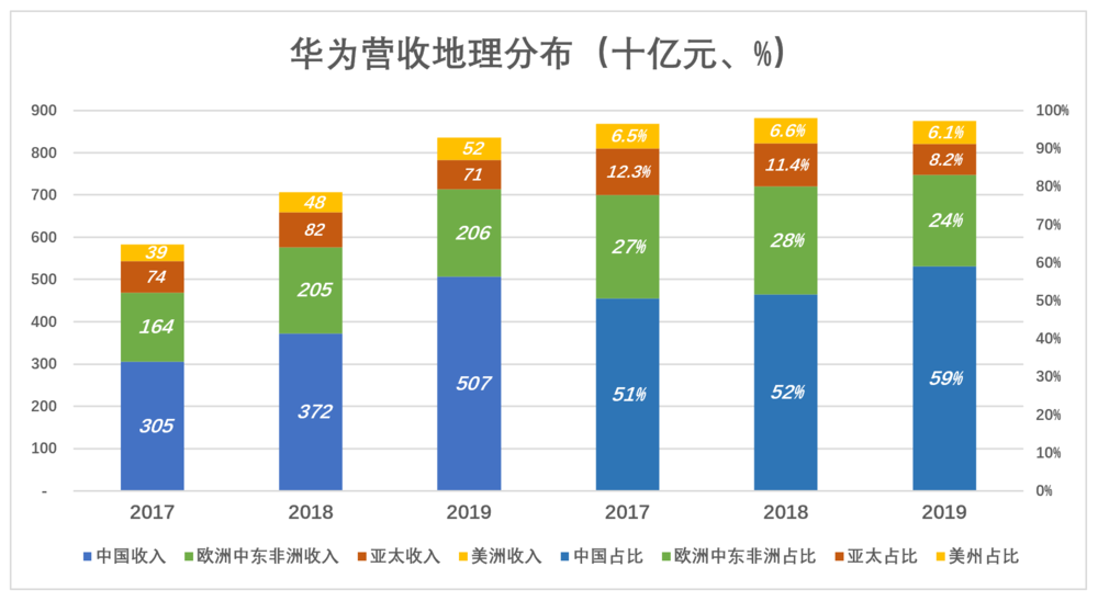 中国始终是华为的主要市场,而且近三年收入及占营收的份额均稳步提高。2017年中国市场收入3051亿,占营收的51%;2019年中国市场收入5067亿,占营收的59%。