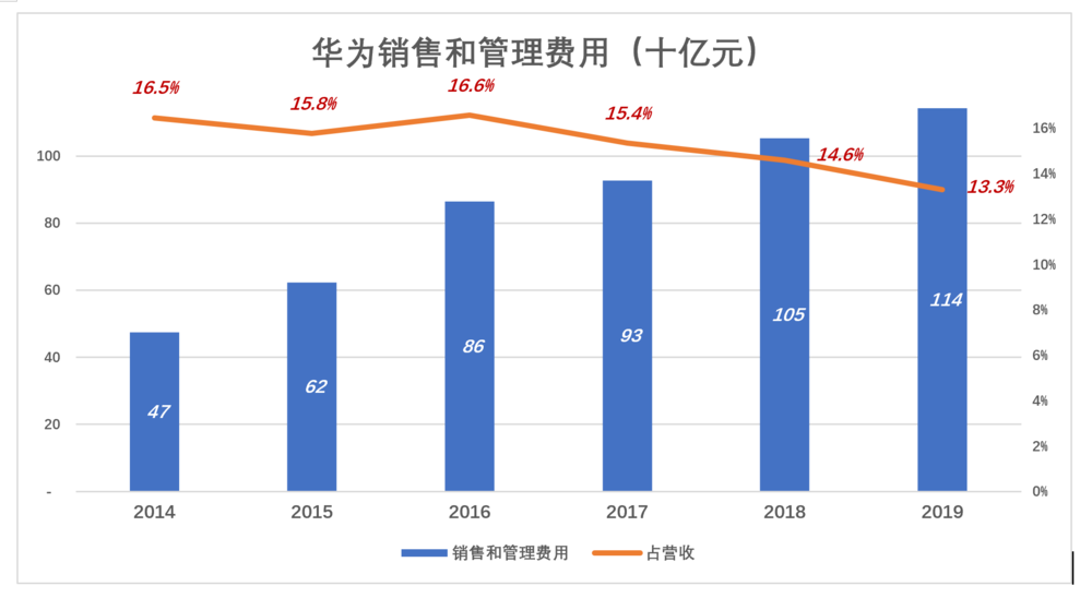 华为的厉害之处在于,转向to C过程中“销售和管理费用率”不升反降:2014年“销售和管理费用”475亿,占营收的16.5%;2019年“销售和管理费用”达1142亿,占营收的比例却降至13.3%。