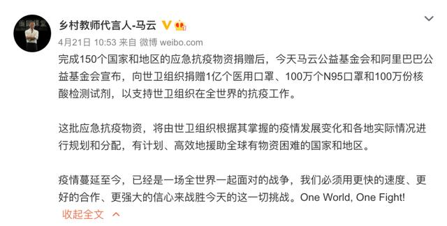 “One World, One Fight!”,疫情期间,马云的微博常以这句话作为结尾。