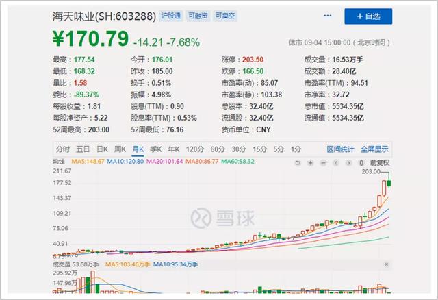 2020年9月3日,海天味业的股价触及203元的高位,最高市值突破6500亿,远超中国石化(4800亿),逼近中国石油(7800亿)。