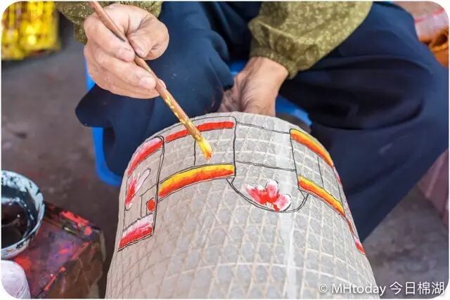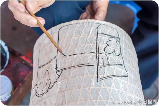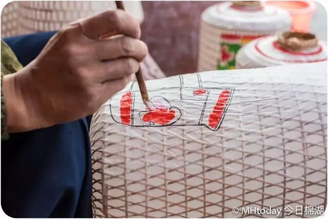 吴师傅用细毛笔在灯笼上细细勾勒出吉祥图案,然后用各色颜料进行上色,并写上吉祥语。绘画的灯笼比写字的灯笼花费的时间较长,也更需要耐心。吴师傅的妙笔生花让原本枯燥的时间添了一丝趣味,也赋予了平淡无奇的灯笼平安吉祥的寓意。