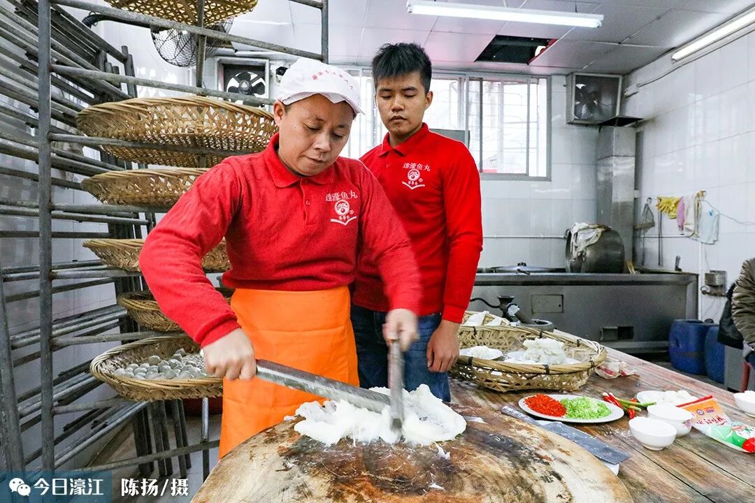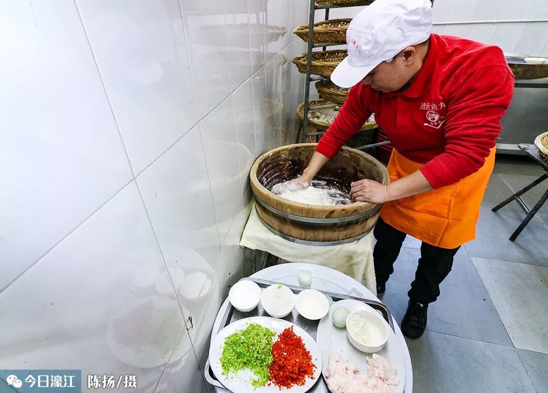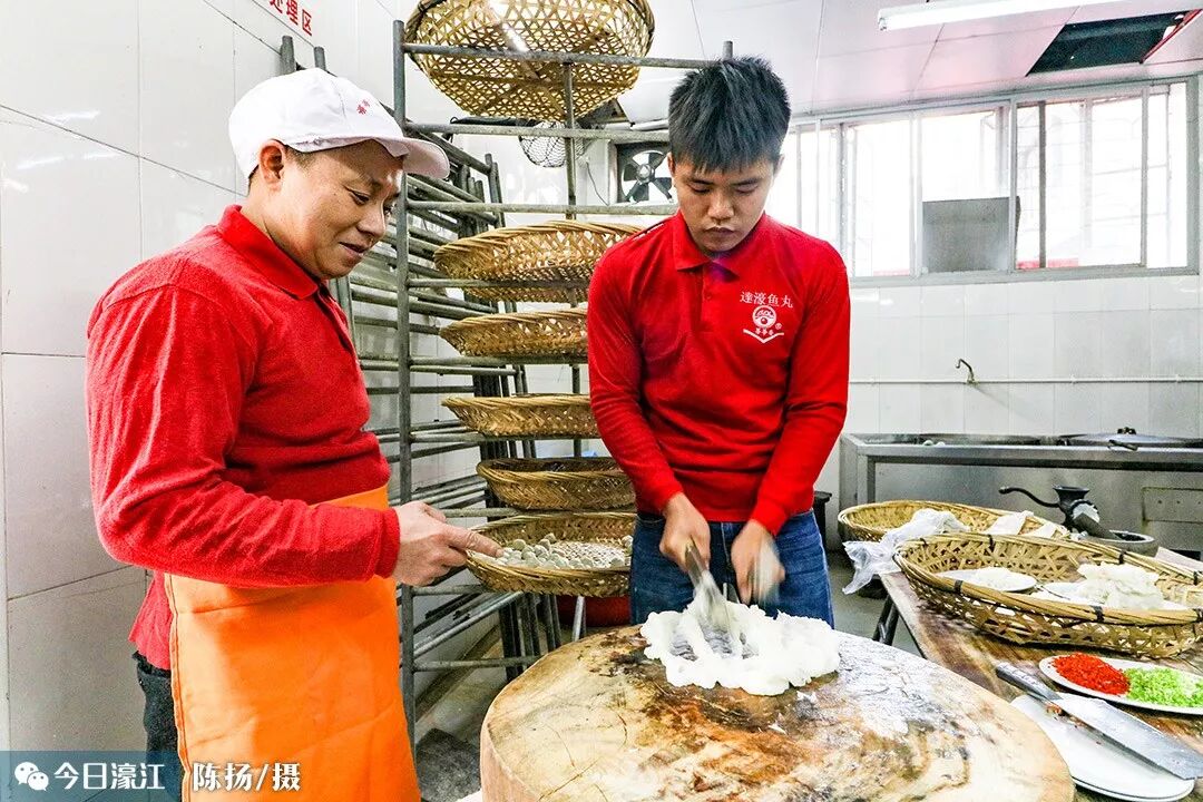 传统的做法是用铁棍锤打成肉糜,装入特制木桶内,用手掌快速搅拍成鱼酱,让墨斗肉起胶,柔软有弹性。