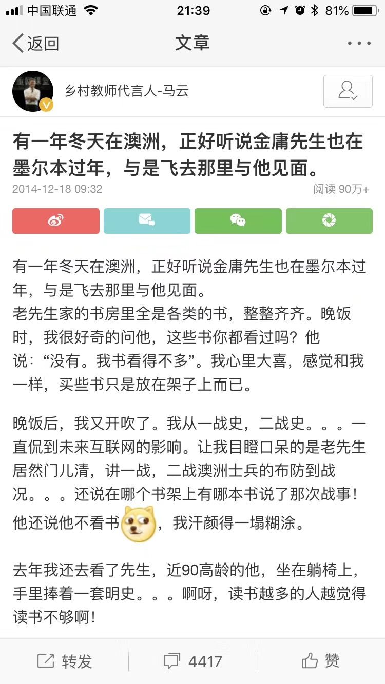 金庸的小说能够几十年经久不衰,打动几代读者,一个最大的特点就是三观极正。正因为如此,金庸的小说能够形成最广泛的民间共识,下至平民百姓上至高官显贵,圈粉无数。而商业大佬们从金庸小说中汲取的养分,一定程度上也给自己的财富人生注入了真气。 ![]() 马云:花名“风清扬”,男人一定要看金庸小说 除“企业家”的身份外,马云还有一个浓厚的武侠梦。
