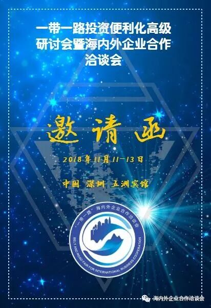 2018一带一路投资便利化高级研讨会暨海内外企业合作洽谈会,将于11月12日在深圳五洲宾馆隆重举行。