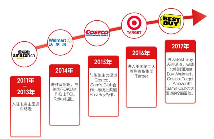 在渠道上,仍以北美市场为例,2011年初入北美市场时,TCL将主要精力放在亚马逊,虽然知名度不高,但TCL的电视却超过三星、松下,一直稳坐亚马逊畅销排行榜。而目前,TCL已经覆盖BestBuy, Walmart, Costco, Target, Amazon和Sam's Club美国六大主流渠道。
