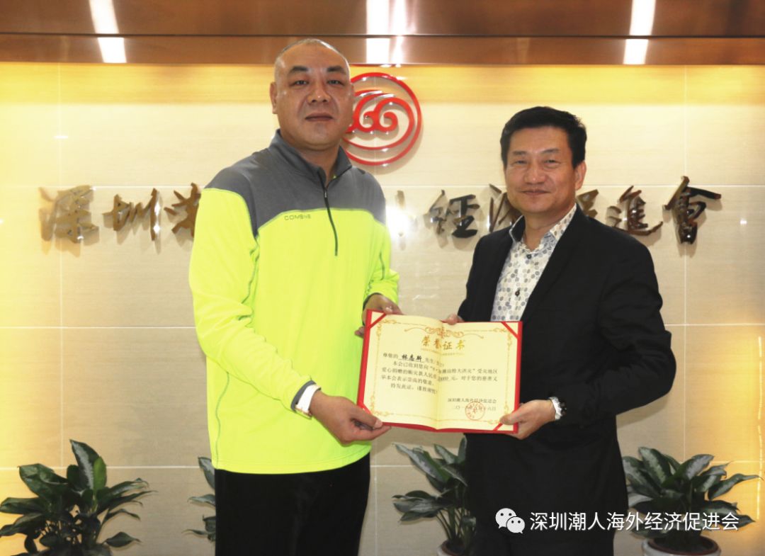 在本会8·30潮汕特大洪灾“献爱心捐款赈灾”活动中,林志斯理事长为灾区人民慷慨捐款,赵财强会长和陈健辉常务副会长分别为林志斯理事长颁发特别贡献奖纪念牌、荣誉证书。