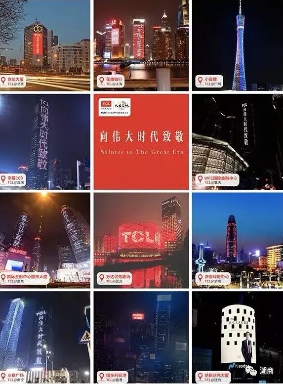 向伟大时代致敬 10月29日晚,大国品牌纪录片《向伟大时代致敬》在央视一套播出。片中,TCL集团董事长、CEO李东生讲述了TCL从偏僻小厂到千亿全球化企业一路走来,见证中国经济的强劲动力与改革开放40年的伟大成就的故事。 ▲CCTV大国品牌纪录片《向伟大时代致敬》 在北京、上海等城市的机场、高铁站、热门商圈大屏、剧院等人流集中处,也同时出现了TCL投放的向伟大时代致敬的海报。内容是李东生的四句话: 实业的根越深,经济的脊梁越硬 从制造到智造,从巨大到强大 我们坚持创新,努力把未来带到眼前 用从不计算梦想,到努力收获梦想 李东生的讲述以及“向伟大时代致敬”主题也迅速成为社交媒体热门话题:大V不断转发、多位知名经济学家对金句进行了点评:吴晓波从熟识好友的身份讲述了对于李东生的个人印象,管清友从智能制造角度,叶檀以实业角度,向松祚从创新角度,水皮则从梦想角度解读金句。如今,#向伟大时代致敬#的微博话题阅读量已经过亿。 由TCL抖音官方账号首先发布的“致敬时代新姿势”挑战,也在众多红人带动下,在年轻一代中激发出一轮致敬时代的热潮。 早在今年2月,TCL和李东生就已掀起一轮“致敬时代”的情怀与热潮。当时,以TCL发展历程为聚焦的纪录片《时代》在央视播出,还原了李东生带领企业在改革开放大潮中砥砺前行的故事,引发了广泛关注。 之后,《人民日报》《光明日报》等十大核心媒体同时刊出了TCL“向伟大时代致敬”的号召。紧接着,TCL又强势点亮北京、上海、广州、香港、纽约等国内外11个城市标志性建筑户外大屏,发出“向伟大时代致敬”的强音!