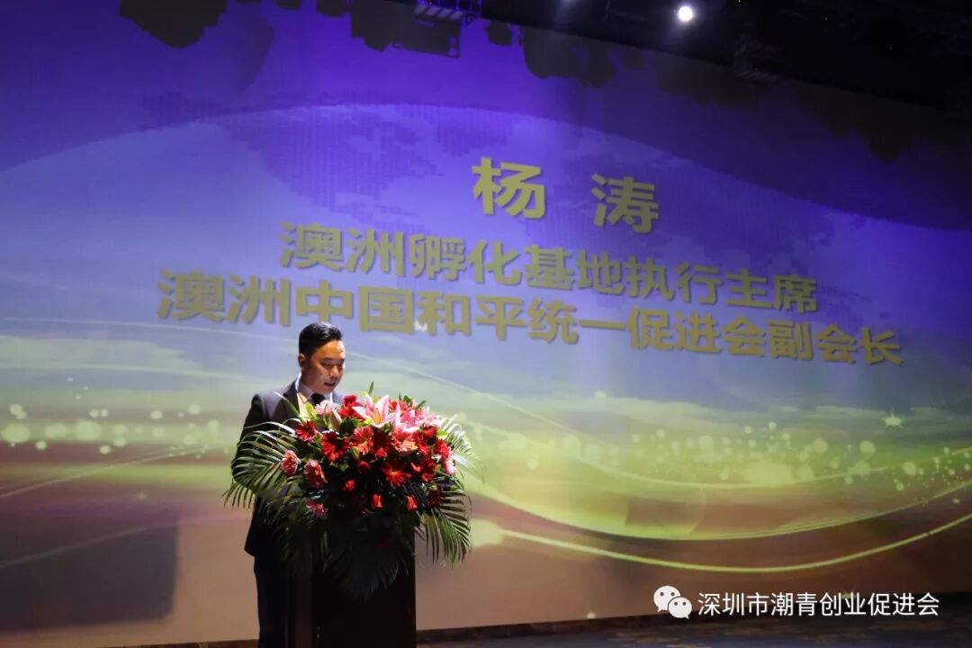 深圳潮创会澳洲孵化基地执行主席杨涛在仪式上致贺词,感谢蔡文川会长关心和关注在澳洲留学的青年人,设立潮创会澳洲孵化基地提供给在澳洲留学的青年毕业以后回国创业的正能量平台,并分享澳洲孵化基地的会务发展情况,表示全力响应潮创会总会的号召、加强澳洲潮青和国内潮青的联动互访,为潮创会打造全球潮青创业互助平台做好国外市场服务工作。