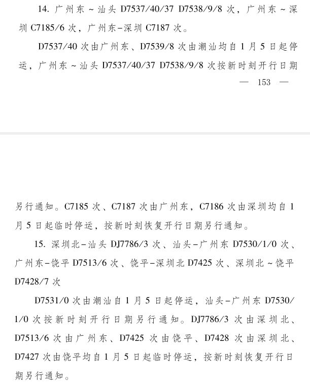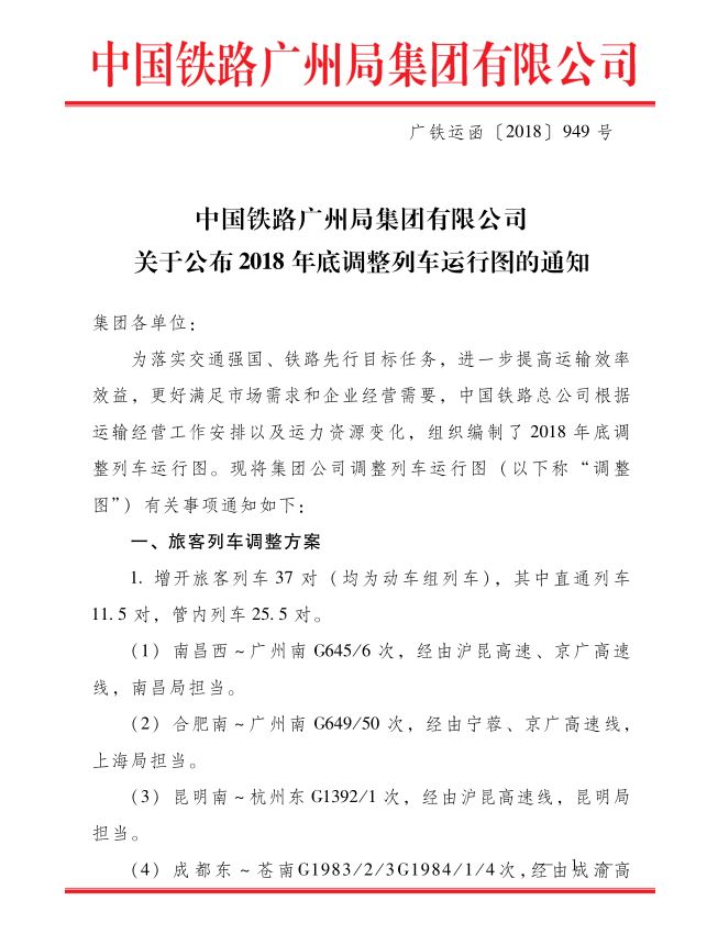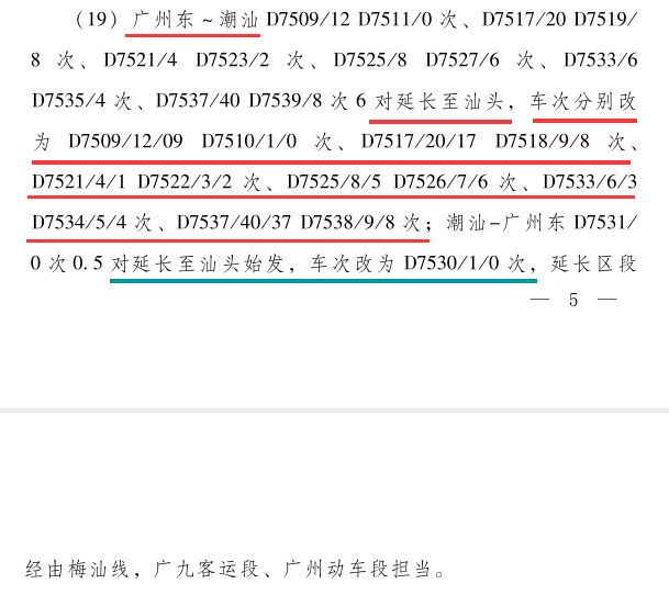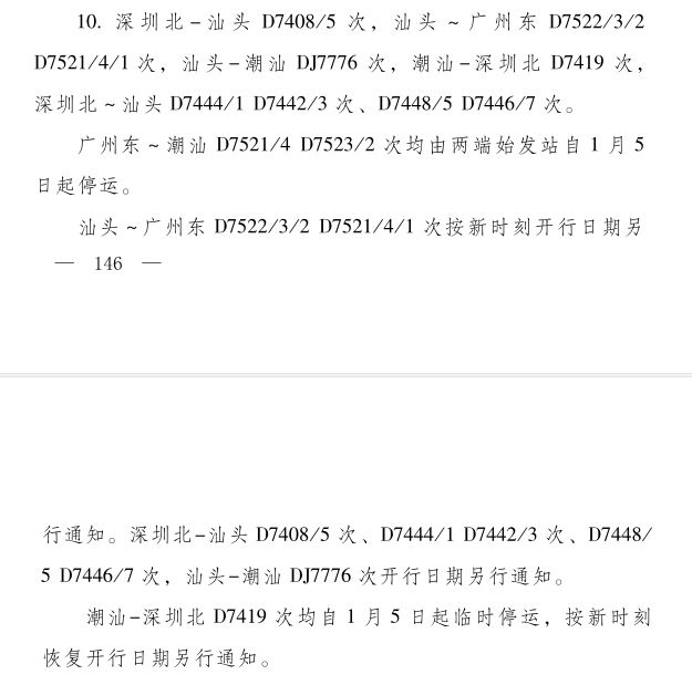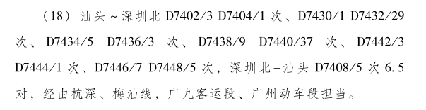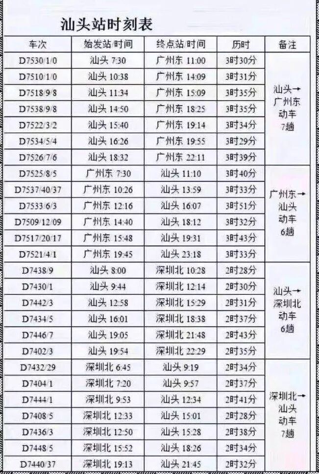 从1995年广梅汕铁路全线通车,汕头市区实现铁路通达,到今年高铁动车组即将开通运行,汕头开始进入高铁时代,真正纳入全国高速铁路网络体系。从汕头市区乘坐动车,汕头市民可以在3个小时左右通达广州、深圳、厦门甚至香港等地,出行便利性将有质的提升。 近日,小编收到一份中国铁路广州局集团有限公司关于公布2018年底调整列车运行图的通知,文中明确提到: 1、旅客列车调整图自2019年1月5日零时起实行。 2、特快和快速货运班列调整图自2019年1月5日零时起实行。其他货物列车调整图自2019年1月4日18时起实行。