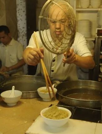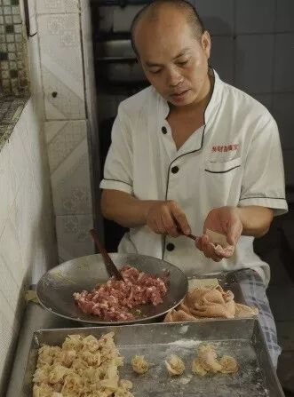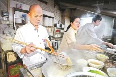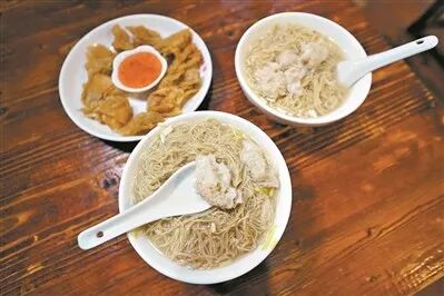 △标准的金鱼尾云吞。 其实,做好这一家店,也并不轻松。吴锦云和吴锦星轮流,一个白班一个晚班,没关过一天店。“你问我累不累?看我的黑眼圈。”吴锦云指着自己的眼睛笑着说。被问到为何要这么做时,他给记者看了几张照片,当时是台风天,巷子里的积水漫到小腿,几位街坊卷着裤腿来吃面,这让吴锦云十分感动。千里迢迢回国寻味的华侨、看了攻略特地前来的游客、不顾风雨蹚水光顾的市民、帮衬多年跟家人一样的街坊……这些都让吴锦云珍惜,他说,不能让他们扑了空,留下遗憾。每年春节别人阖家团圆的时候,都是吴家人最忙碌的时候,“给帮工多开一个月工资,也不能停业一天”。 吴锦云还有一个规矩——不许包场。之前有位年过五旬的男子从海外回国参加同学会,看中了吴财记的场地。“我告诉他不能包场,建议他们在下午三四点人少的时候来,这样既能满足聚会需要,也不会影响其他食客。这不是钱的问题,不能让来的人因为包场被拒之门外。” 面店的食客除了街坊,还有许多学生、白领和游客,不少生面孔是奔着“米其林餐盘奖”来的。“特地带北京的朋友来尝尝广州的米其林小吃,点了炸云吞和牛腩面。”一位陈姓小伙说。今年6月28日,首版《广州米其林指南》正式发布,吴财记入选“35家餐盘奖获奖餐厅”。此后,吴财记迎来不少米其林的拥趸,周末更是门庭若市,顾客一直排到了巷口。