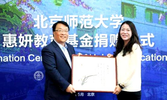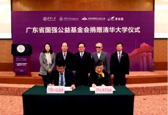 杨惠妍、杨国强(后排左1、左2)、陈翀(前台左)出席国强公益基金会捐赠清华大学仪式