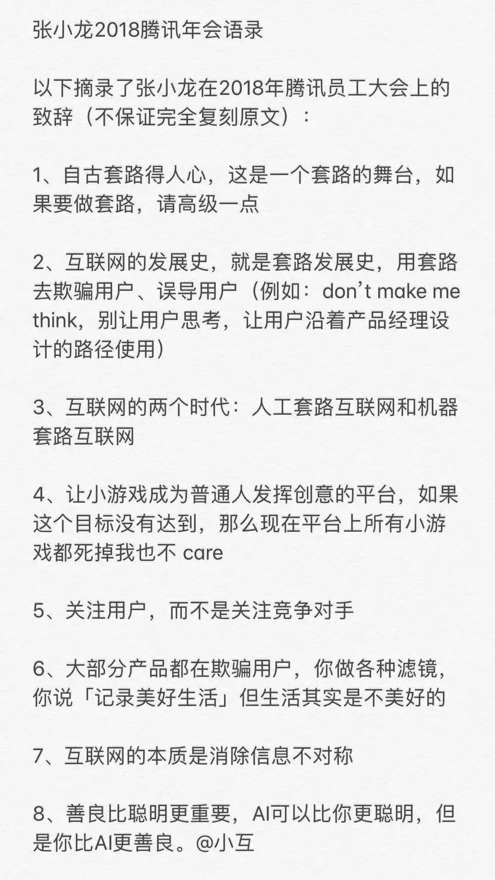 不仅腾讯员工疯狂膜拜,就连互联网圈都沸腾了,张小龙的段子水平越来越高了,把互联网的现象,看似毫无逻辑的事情被他们说成了语录。 看事情不能看面子,得看里子,张小龙的段子,反映了他的反思和提醒,金错刀认为: 1、互联网负向套路太多了!“互联网的发展史,就是套路发展史,用套路去欺骗用户、误导用户。”其实,套路就是标准化,就是流程化,有正向套路跟负向套路,区块链割韭菜就是负向套路,要反思。 2、机器套路时代是一个洗牌。“互联网的两个时代:人工套路互联网和机器套路互联网。”正向的机器套路时代还是要大力积极拥抱的。 3、好产品的重要逻辑:“善良比聪明更重要”。思考下:机器套路时代,张小龙还能继续指引产品的方向吗? 以下是马化腾、刘炽平、任宇昕和张小龙的部分演讲,内容来自腾讯文化。 马化腾(Pony): 下半场是产业互联网 管理者要能上能下 作为腾讯的创始人和掌舵者,马化腾是站在“上帝”的视角看问题,他说,要想成为“最受尊敬的互联网企业”,就必须完成三个使命和愿景: