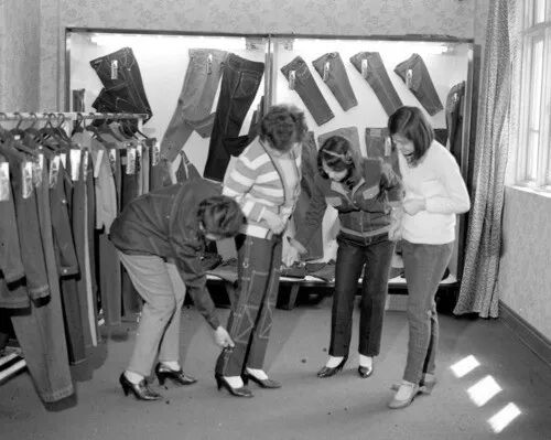 1987年拍摄的天津市服装七厂的职工们在试穿出口的牛仔裤。在80年代,紧身牛仔裤已成为时尚青年的潮流单品。新华社发