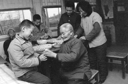 除夕晚上及初一早上吃饺子的习俗在中国北方一直沿袭至今。这是北京丰台区黄土岗公社刘甲村社员张占鳌一家在包饺子。新华社记者吕全成摄(1984年2月11日发)