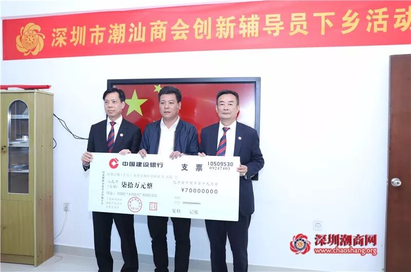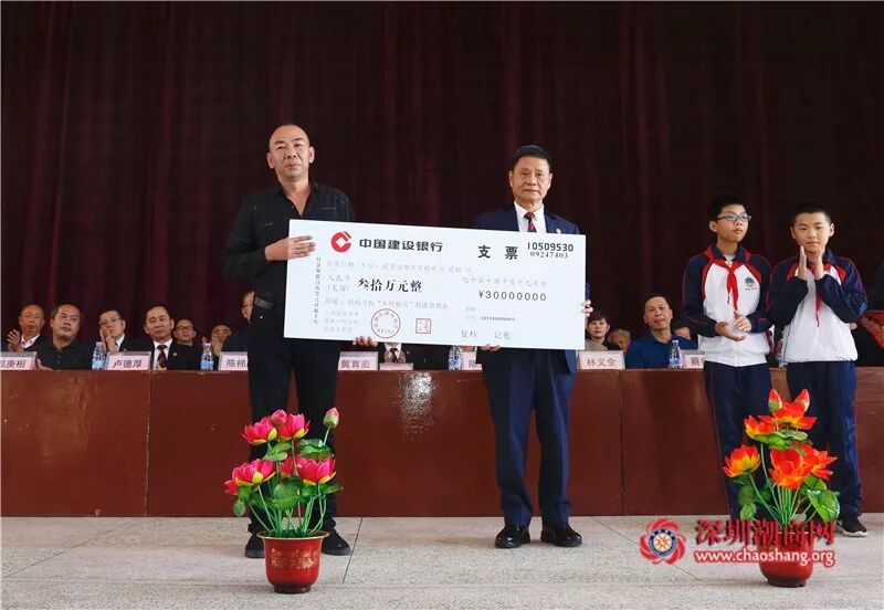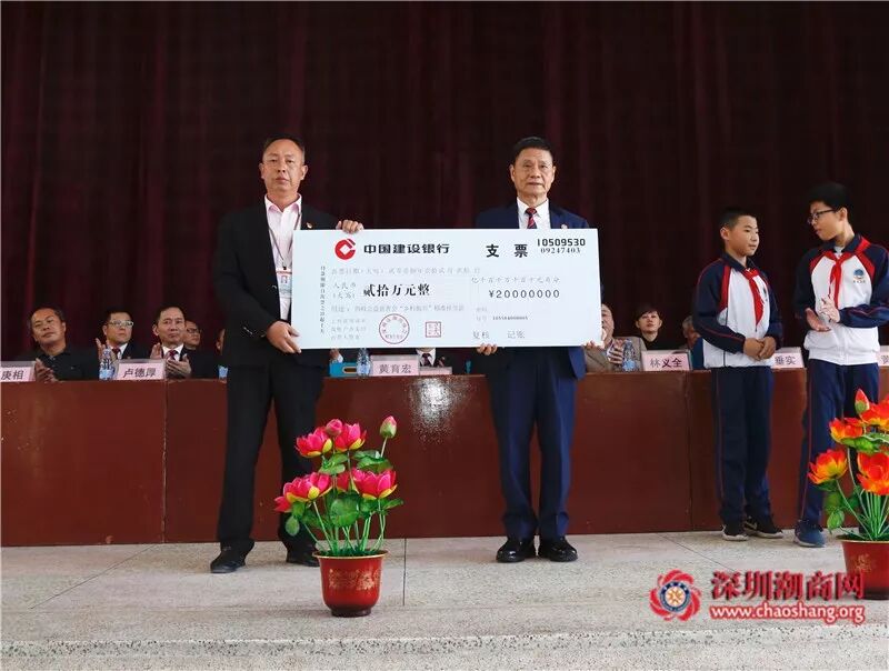 黄育宏驻会会长(右)代表商会向潮南区西岐学校捐赠“乡村振兴”精准扶贫款30万 活动上,西岐学校聘请黄育宏驻会会长为校外辅导员。黄育宏驻会会长代表商会向西岐村捐赠50万元,其中,20万元捐赠给西岐公益慈善会作精准扶贫款,30万元捐赠给西岐学校作精准助教款。