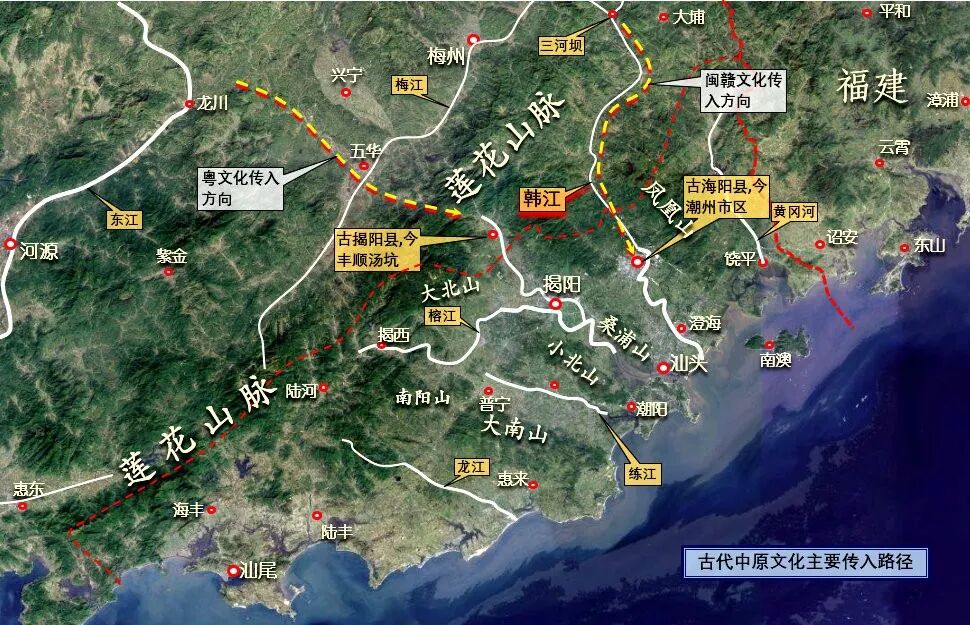 这段时期,潮汕地区的文明接受方向,从西面的广东,转向北面的福建,毕竟政治文明中心就在福建正北的江浙,大批的移民也是这个方向到来。潮汕平原的政治经济文化重心,也就不可避免的从西北部转向东北部。可以想见,中原移民顺着韩江而来,首先开发聚居的,必然是韩江流出群山下来的第一眼山下平原,此地名叫海阳,现在叫做潮州城。