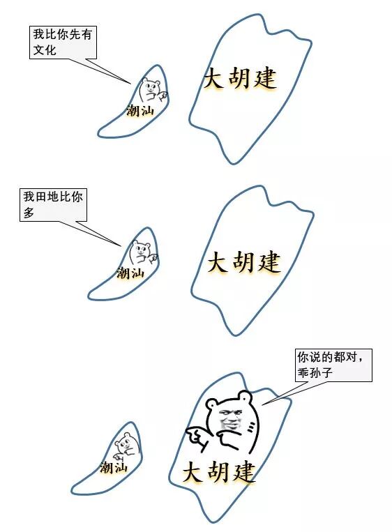 至于中原从秦朝到三国,也就四五百年时间,为何语言变化这么巨大(从粤语变成闽南语),文伯先生也完全不懂,期待将来能有专家解开这个谜题。 大胡(fu)建 东晋这10多万先民,走哪条路来的呢?由于两广腹地虽已繁茂,土地仍足以容纳大量移民,移民们到了粤北及珠三角等地足以安身,没必要再翻过莲花山丛丰顺汤坑过来。因此,来潮汕的10多万先民,主要走的是另一条路,在说这条路之前,咱们先来了解下我们的好邻居——大胡(fu)建。