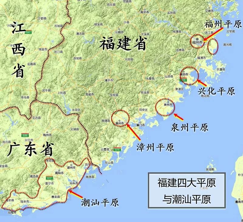 再来看下地形图,我们的大福建,岂止西部全都是山,东南沿海也都是山,也就几条大河入海口冲积出一点小平原,并形成几个城市。福建的所谓四大平原,福州、漳州、泉州、兴化(莆田)平原,加起来都不及潮汕平原的一半大。