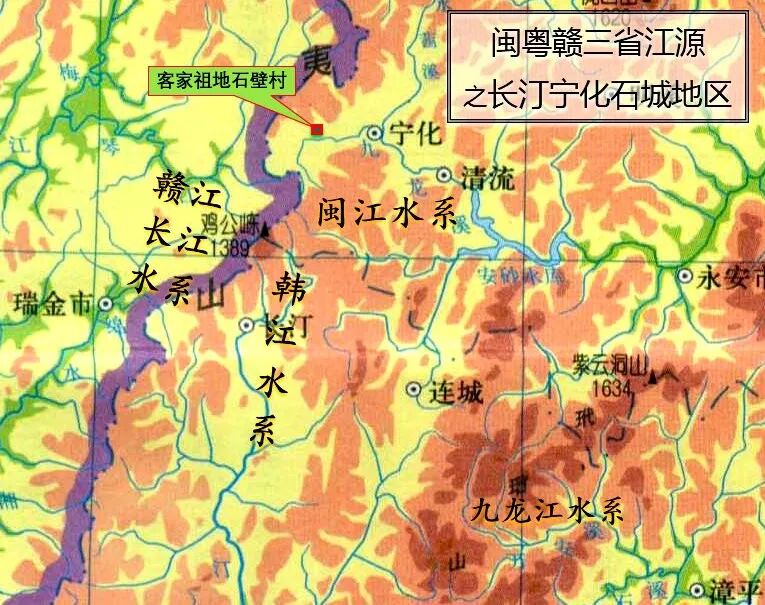 先民们又惊喜的发现,汀江上游这一带方圆五十里内,居然是好几条河流的发源地,有福建闽江水系的九龙溪、有江西赣江水系的琴江和绵水、有广东韩江水系的汀江,东南不远还有厦门九龙江的上游万安溪。这里简直就是粤闽赣三省的水源聚集地,可称东南水塔,因而也就成了三省大山里极为重要的交通集散中转地。九龙溪西溪边上有个宁化石壁村,即是客家人梦牵魂萦的祖宗故地,此乃后话。