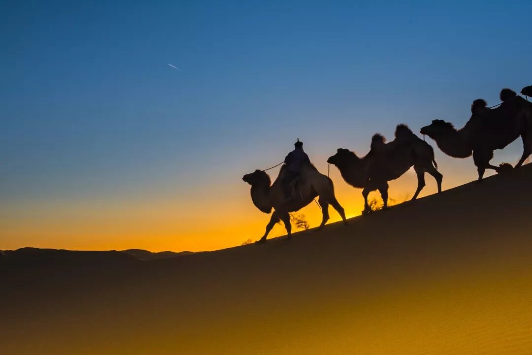 2018-10-11,内蒙古巴丹吉林。远征的驼队踏着夕阳归去。作者:谢鸿业 《侯马白店秧歌》