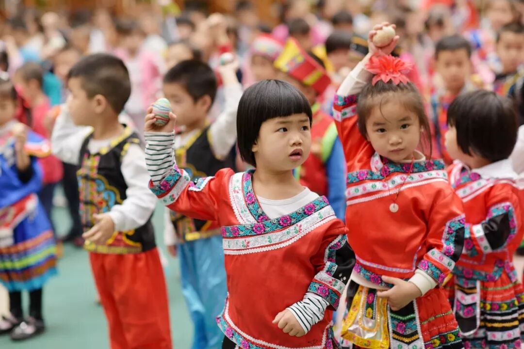 2018-04-13,广西玉林。“壮族三月三”,幼儿园里的孩子穿上传统壮族服装在玩“彩蛋”。作者:Lilith