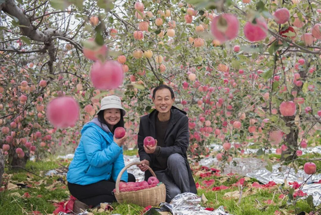 2018-10-29,河南灵宝。寺河乡姚园村“苹果姐”和她的丈夫在自家果园釆摘红苹果。近年来她家的苹果通过网络被销售到全国各地。作者:摄者无疆 《忙碌》