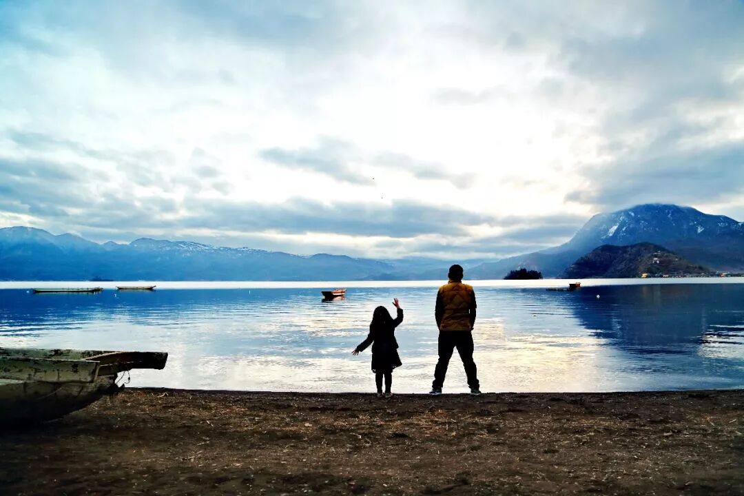2018-04-07,云南泸沽湖。父亲带着女儿自驾云南,在泸沽湖旁打水漂时留影!作者:时髦 《花海欢歌》