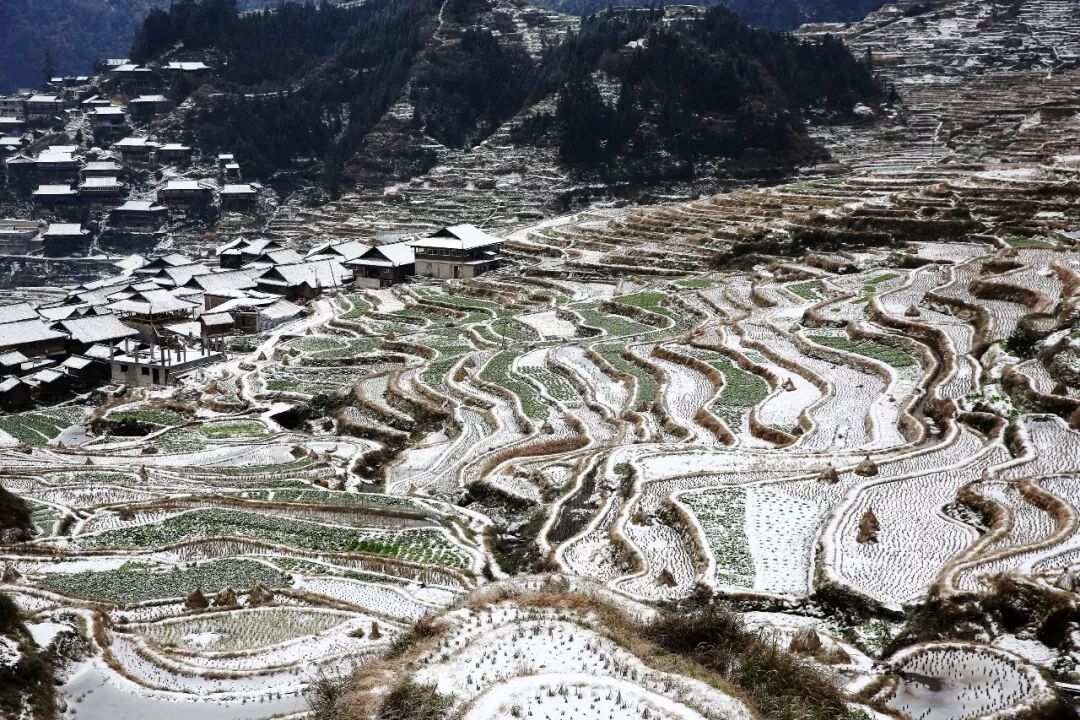 2018-12-30,广西融水。雪后的苗家山寨、梯田银装素裹,美景如画。作者:大苗山人 《与时间赛跑》
