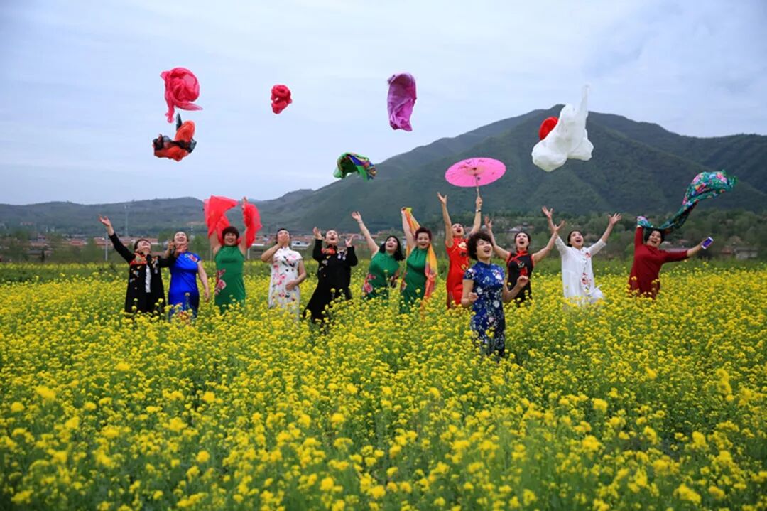 2018-05-06,宁夏泾源。一群游客在风光秀丽的油菜花地上,抛撒花伞、纱巾、帽子,快乐地呼喊。作者:幻影 《洱海作证,我们相爱结婚了》