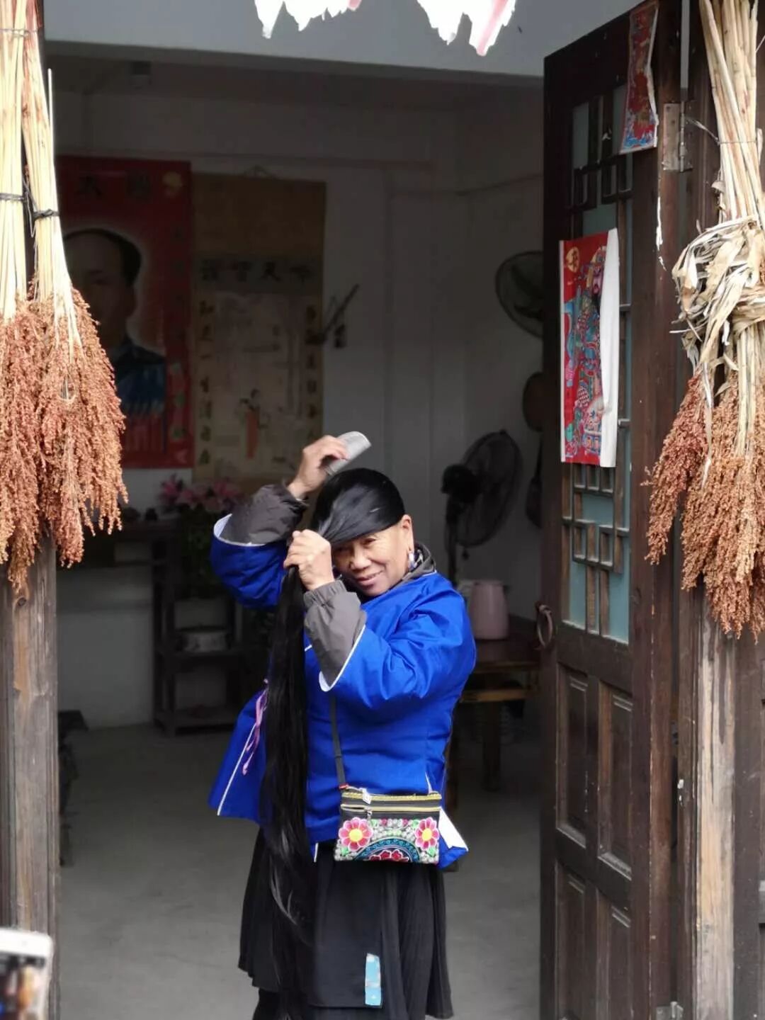 2018-12-10,广西侗寨。一名侗族妇女正梳着她乌黑的长发。作者:梦幻 《陪伴》