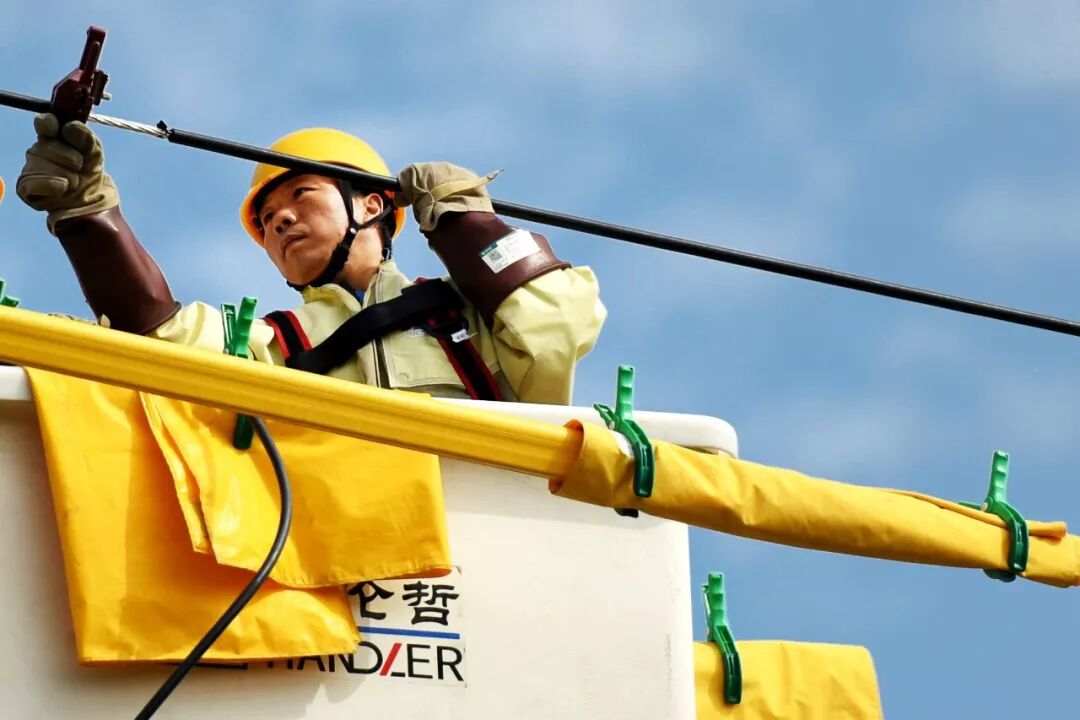 2018-09-06,山东济南。一名电力员工专注进行线路带电作业。作者:CBT 《春耕》