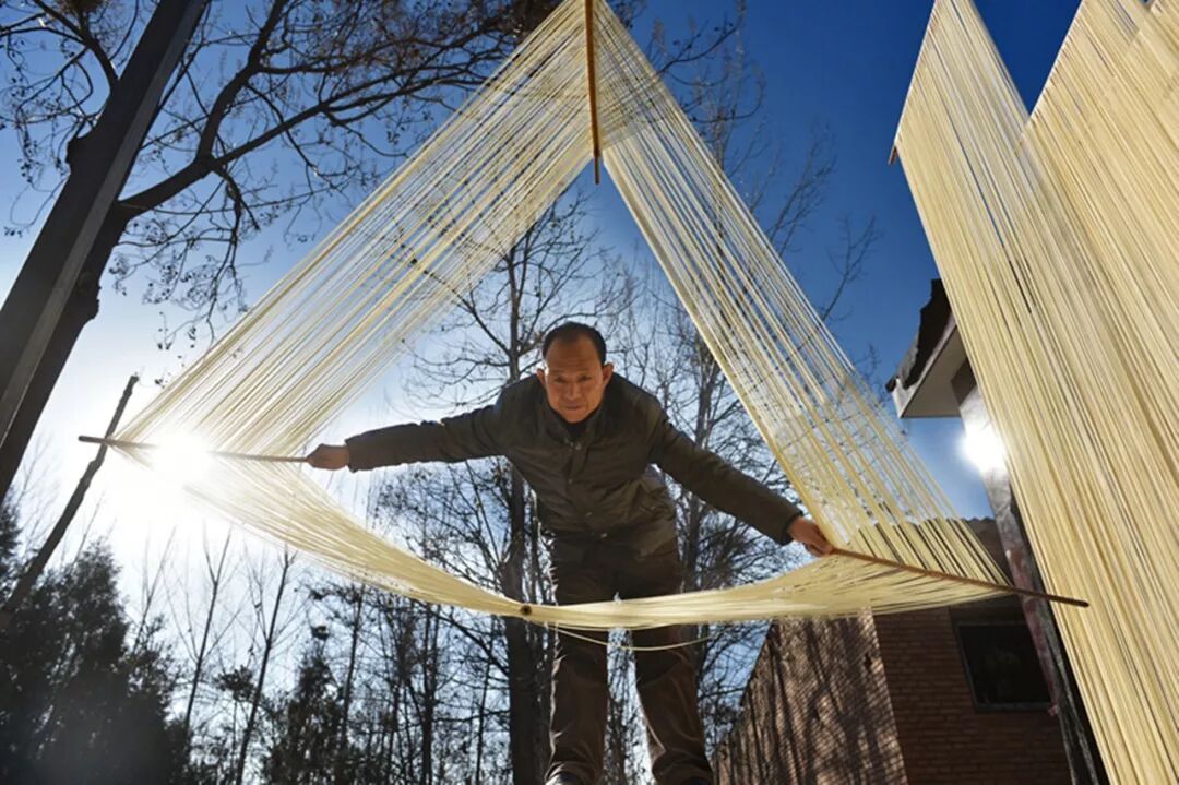 2018-12-13,河南灵宝。川口乡闫谢村李润泽正在自家院子里制作挂面。作者:紫色光 《沙漠骆驼》