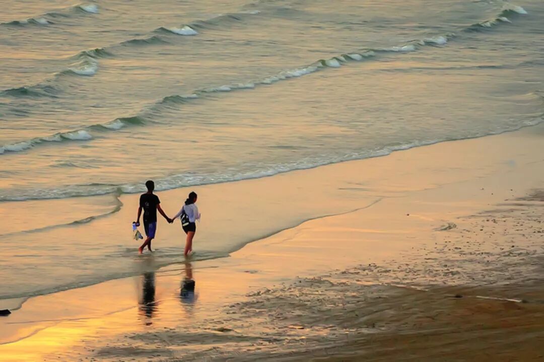 2018-07-22,广东阳江。夏日晚霞,一对情侣牵着手在海滩漫步,享受着阳光的沐浴。作者:不老松 《欢颜》