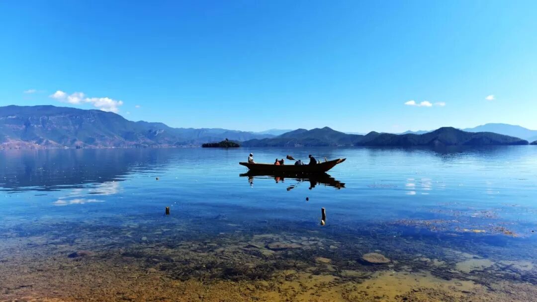 2018-11-02,云南泸沽湖。蓝天白云,小船悠悠。作者:远行客 《乐在花中》