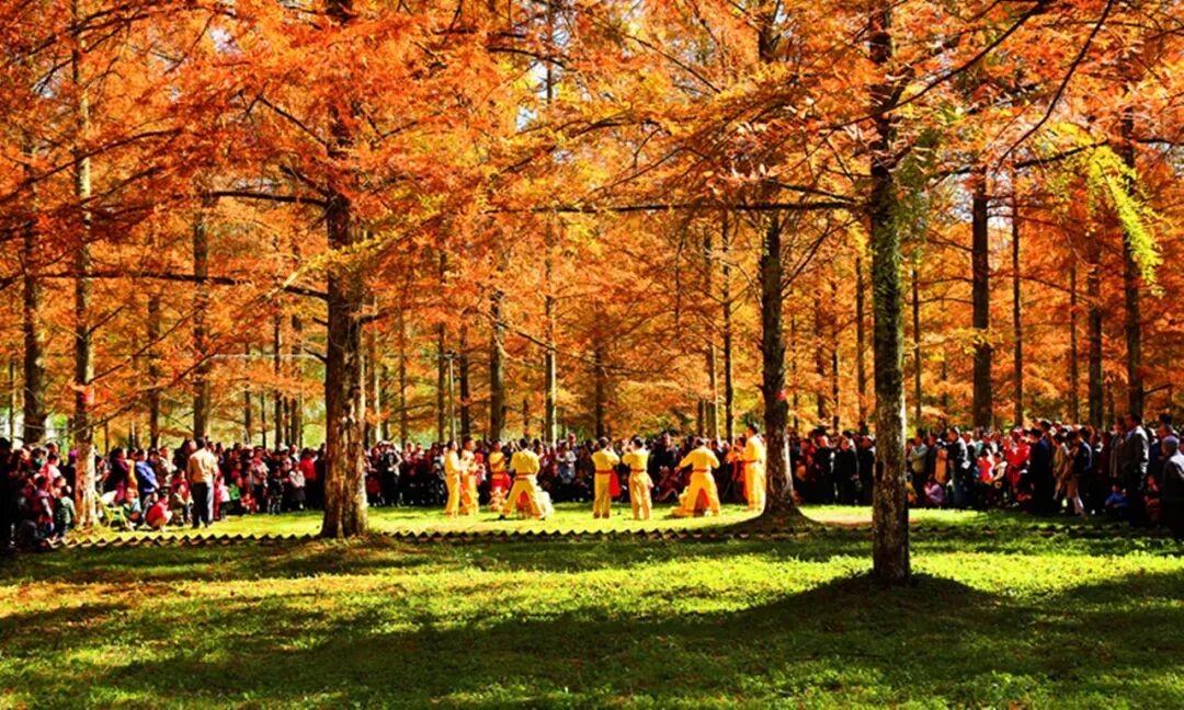2018-11-03,湖北利川。金色的水杉林里满是寻秋赏秋的人。作者:福叶依斯李传书 《 祈福的钟声》
