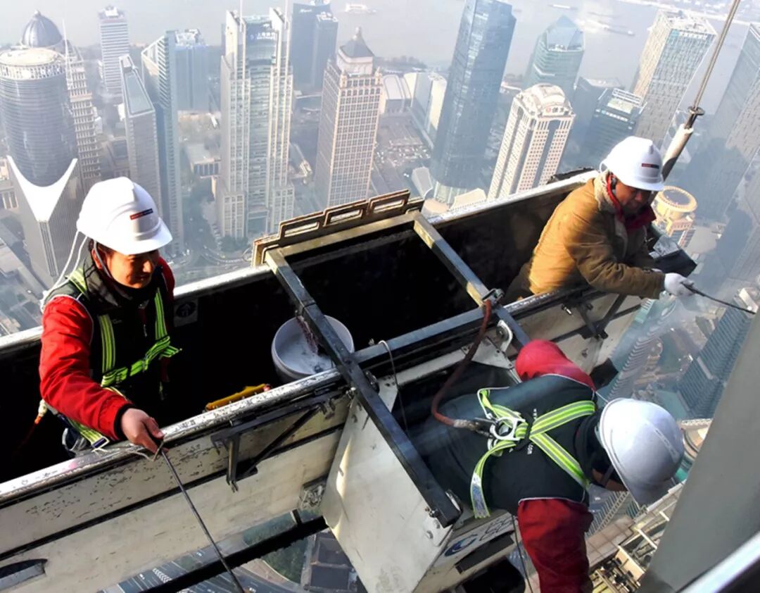 2018-12-13,上海。上海环球金融中心大厦外墙450米高空作业的清洁工,被陆家嘴金融中心众多高大楼宇包围,成了“中心”之中的中心。作者:孙家录 《丰收》