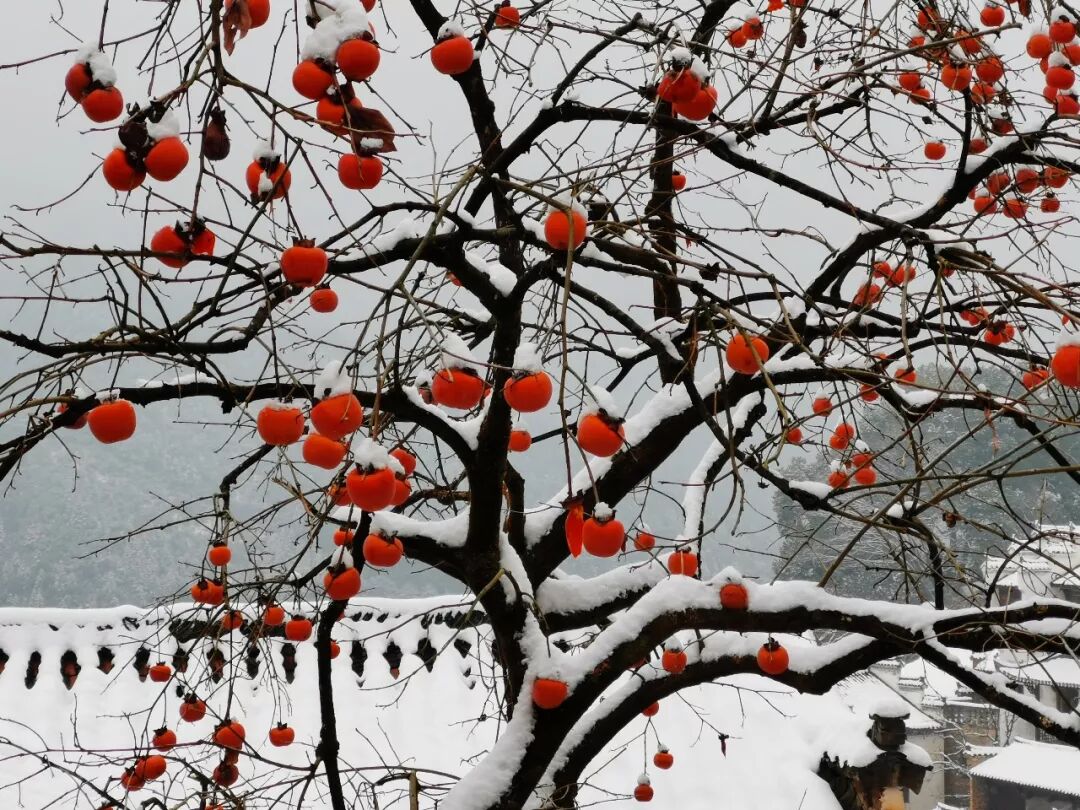 2018-12-31,江西婺源。在中国最美乡村婺源,古村落篁岭喜降瑞雪,满树的柿子如一个个小灯笼,红红火火,喜迎新年。作者:董立新 《大明山冰凌》