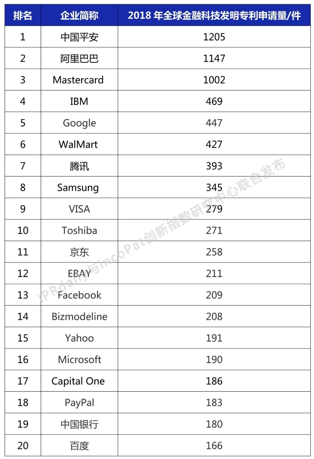 这个榜单,由IPRdaily和incoPat联合发布,它们都是具有国家知识产权局背景的权威知识产权数据提供方,榜单名为“2018年全球金融科技发明专利排行榜(TOP20)”。