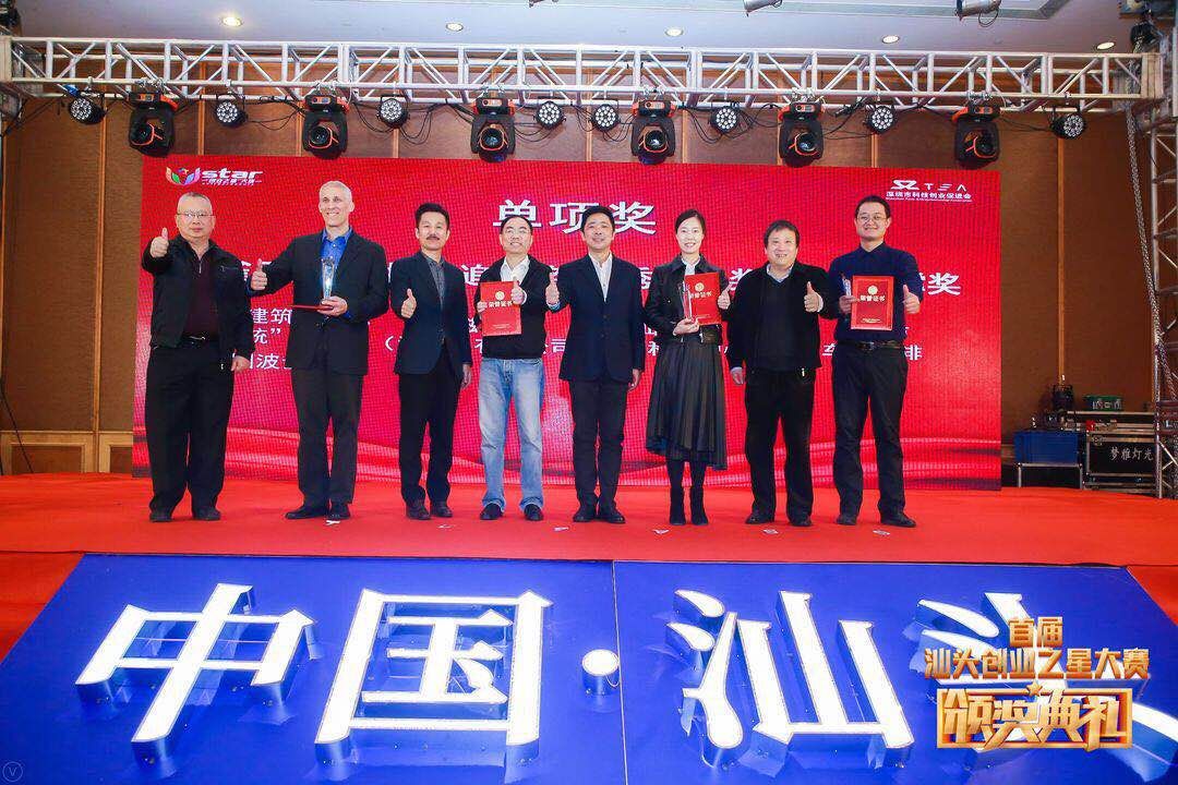 单项奖获得者和颁奖嘉宾合影留念 为鼓励在大赛进程中有意落地汕头的境外企业,组委会特设“孔雀回归奖”;此外,在决赛过程中,根据评委举起“我要投”的牌子给参赛选手进行投票,项目得票数最多即可获得“投资追捧奖”;“优秀组织奖”和“服务支撑奖”则用于表彰支持大赛举办的组织机构。来自美国印第安纳的万用微网智能科技有限公司的“节能建筑直流电源系统”项目获得“孔雀回归奖”,来自爱磁科技(深圳)有限公司的“零回差精密减速机”项目获得了“投资追捧奖”,汕头市龙湖科创中心获得了“优秀组织奖”,汕头市车库咖啡获得了“服务支撑奖”。