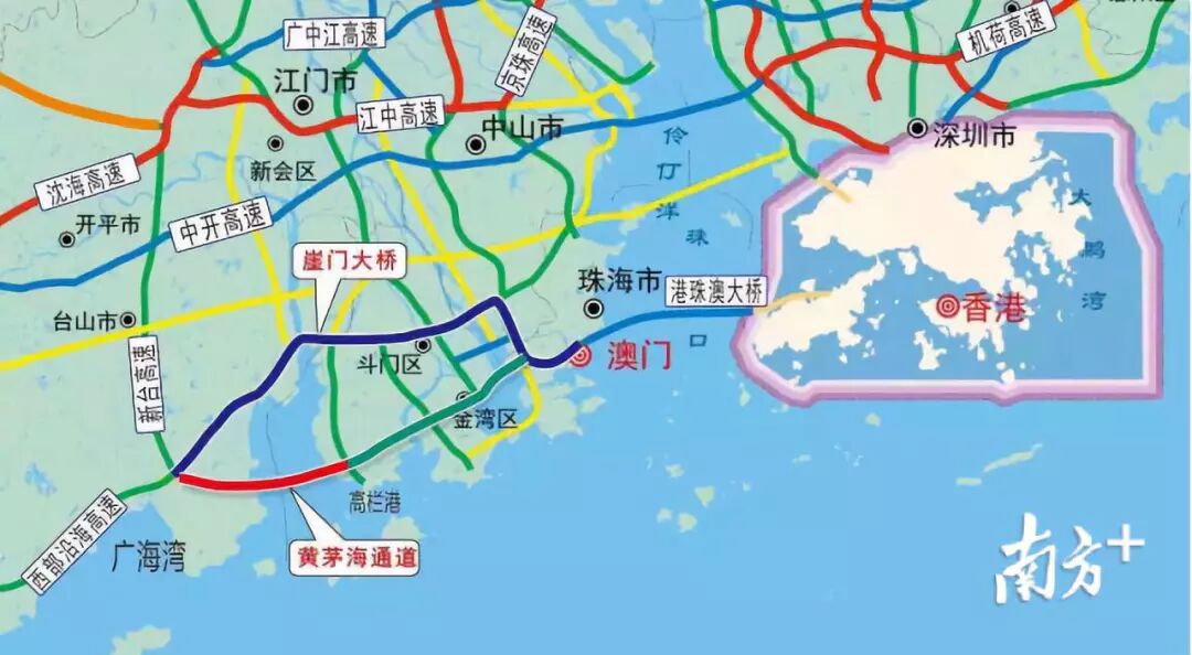 建成通车后 将与已通车的港珠澳大桥、虎门大桥 黄埔大桥,建设中的虎门二桥、深中通道, 以及正在进行前期筹建的莲花山过江通道等 共同组成粤港澳大湾区重要跨江通道 预计澳门至江门广海湾缩短里程18公里 珠海高栏港经济区至江门广海湾缩短里程30公里 这意味着粤港澳大湾区 交通基础设施建设步入全新发展阶段