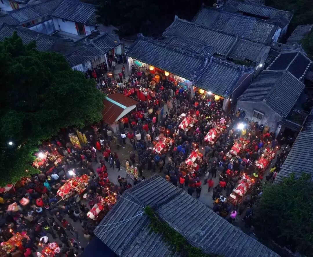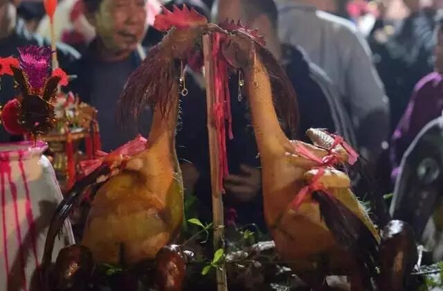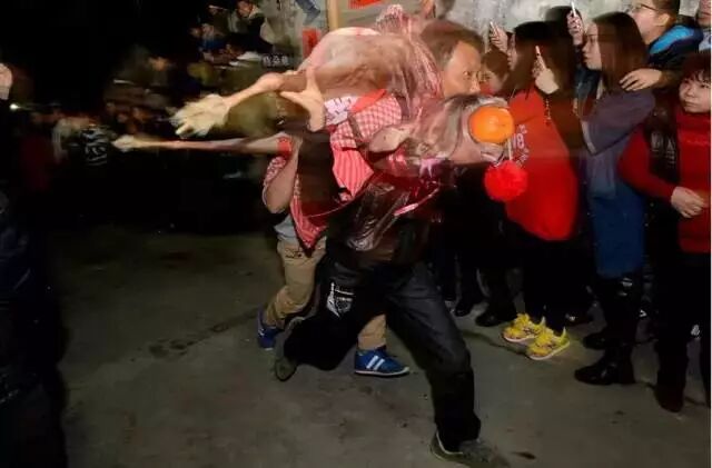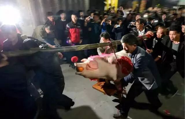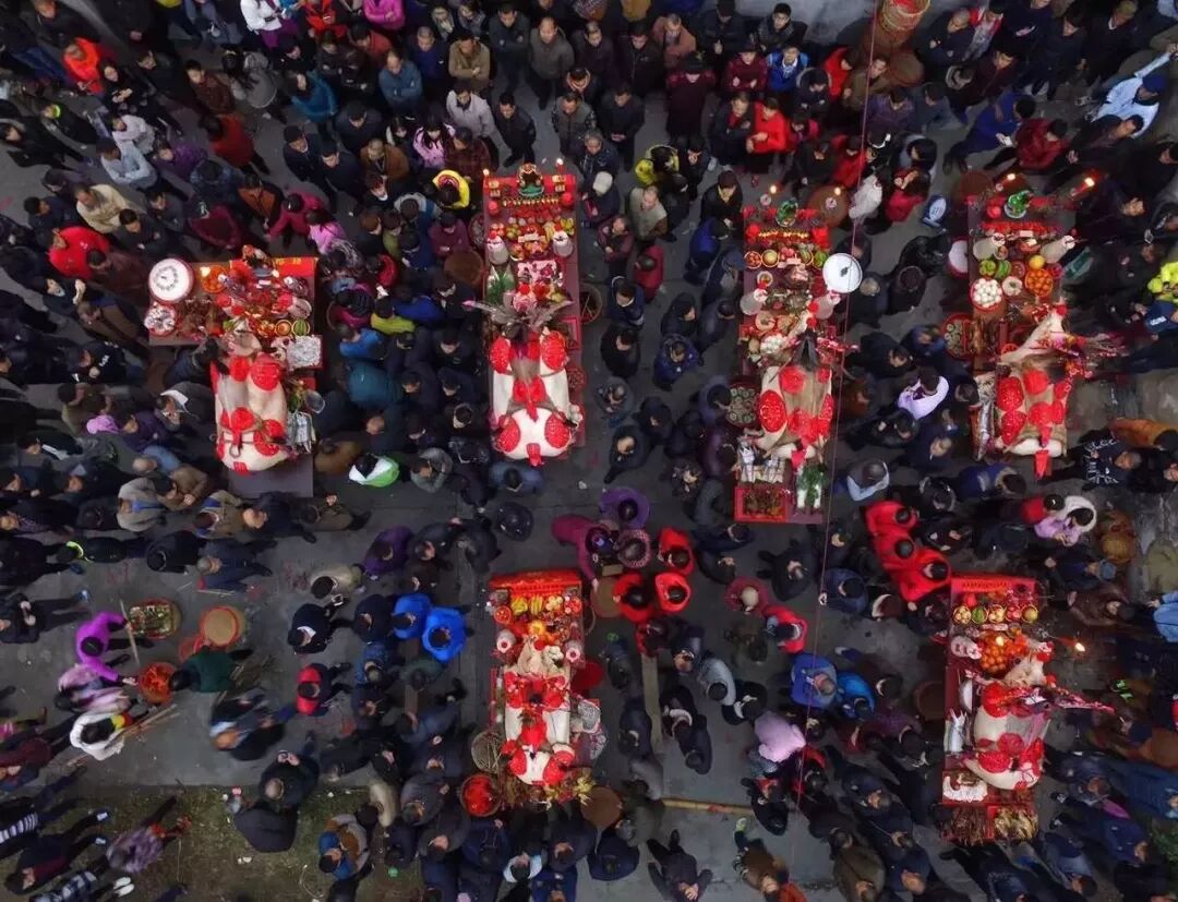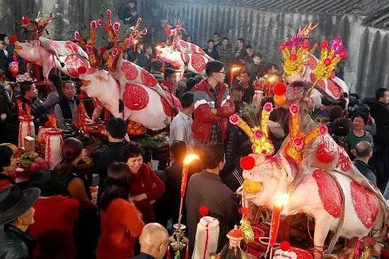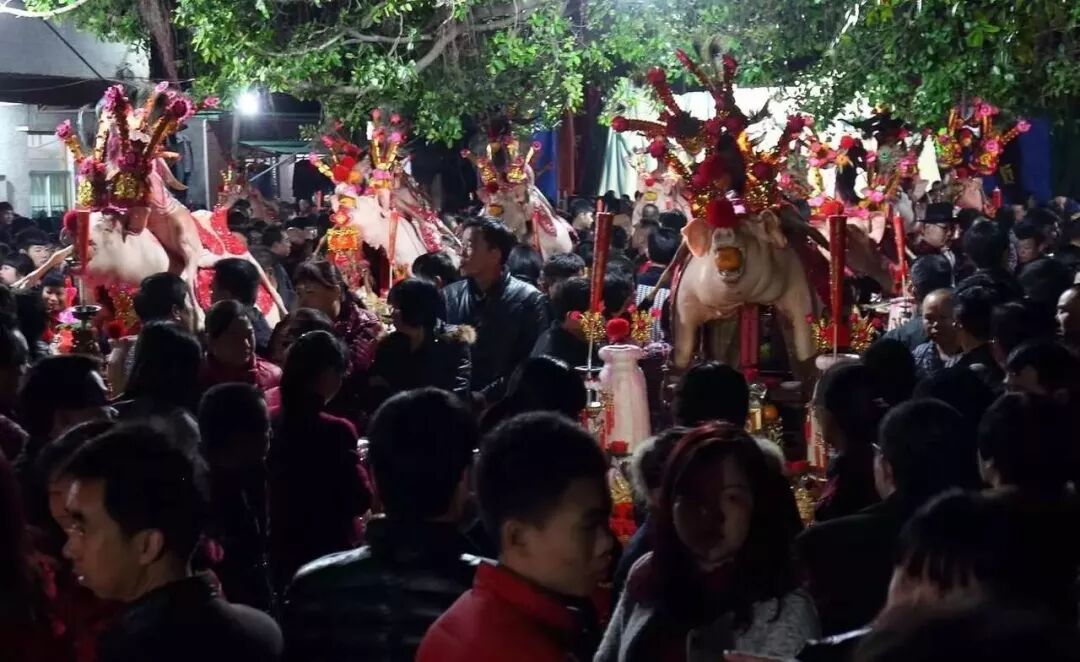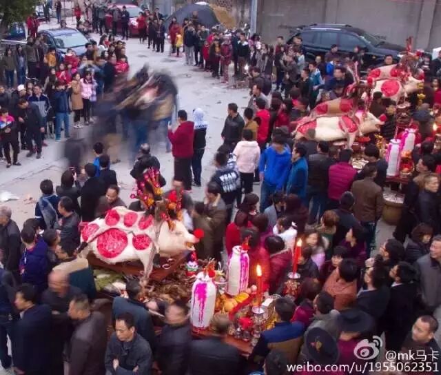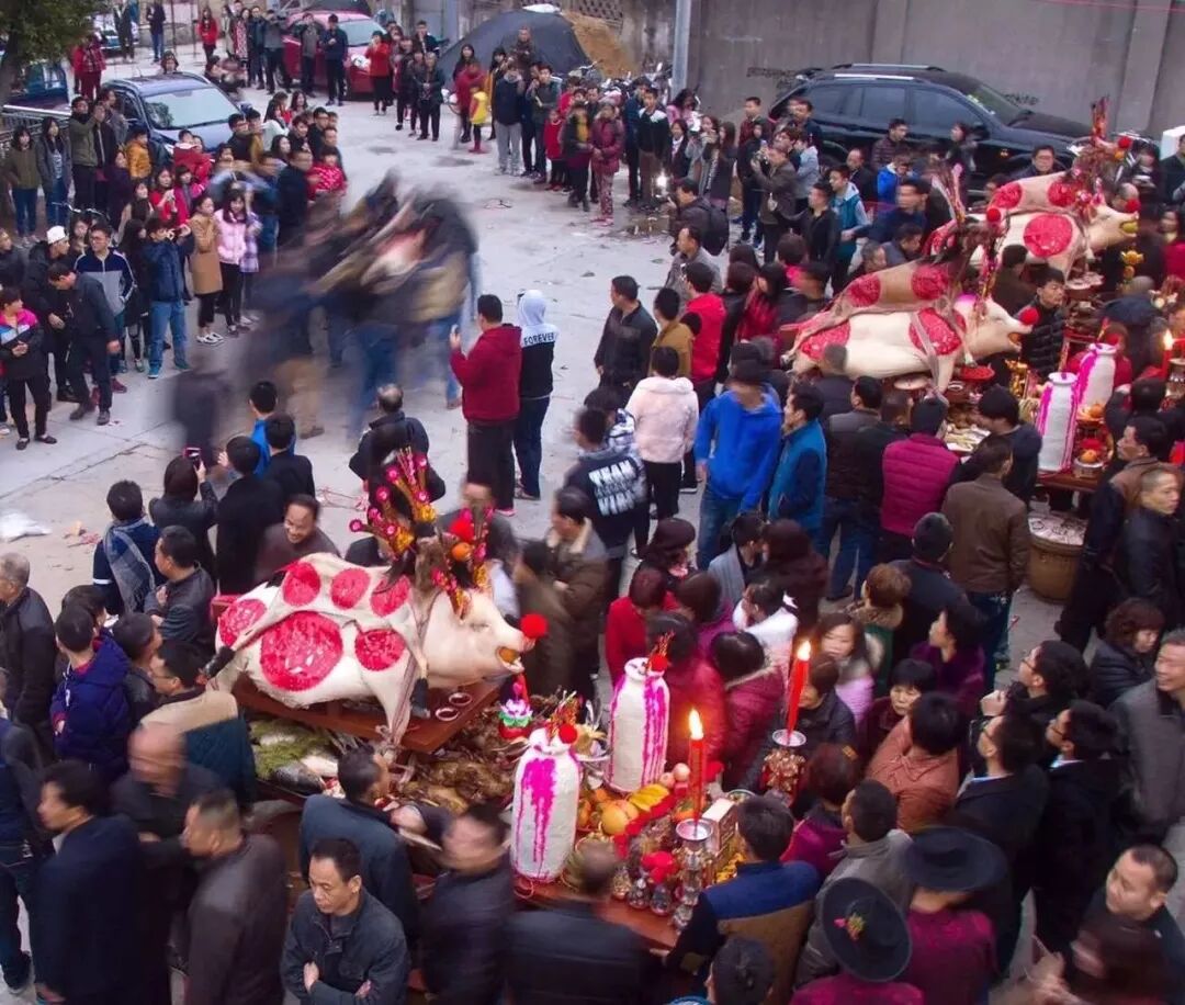 早上4点多,家长们就起床摆猪羊和鸡鹅鸭,直到7点多结束才抬回家。这些大猪被村民用特制的木架高高托起,裂开的嘴里含着石榴或桔子,意喻多子多福和大吉大利,猪背上都戴上大红花,不少主人家还为大猪戴上耳坠,有些大猪上面还驮上一只小羊,俗称“全副猪羊”。